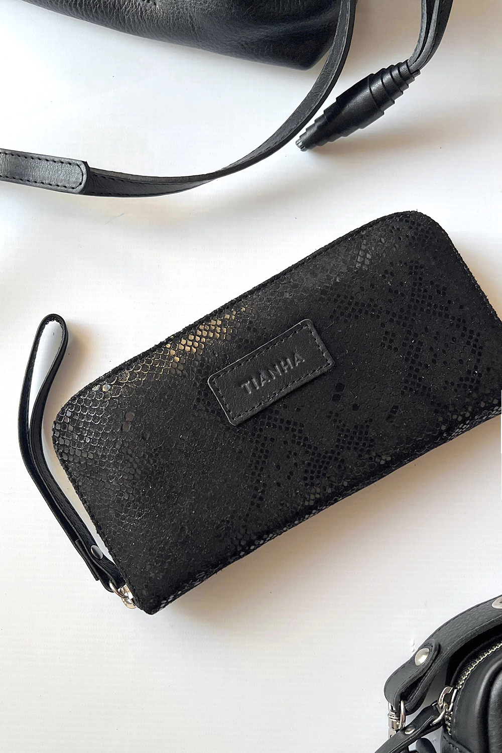 Billetera de tamaño maxi, de cuero con detalle reptil en el exterior, con semibrillo y cuero graneado en el interior. Su apertura es con cierre metálico. Tiene dos compatimentos principales, un bolsillo monedero con cierre, solapa para billetes o papeles y doce espacios para tarjetas. Interior con forrería rayada.